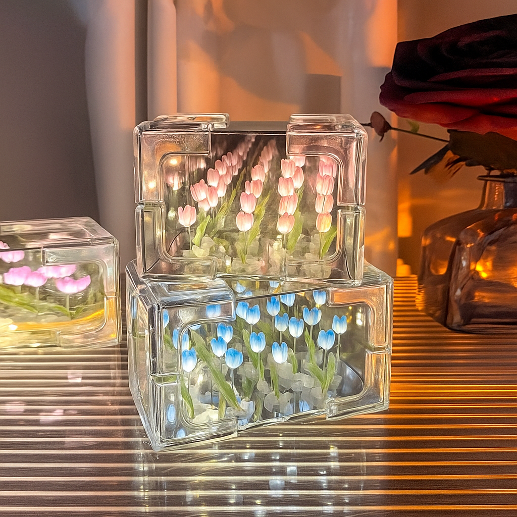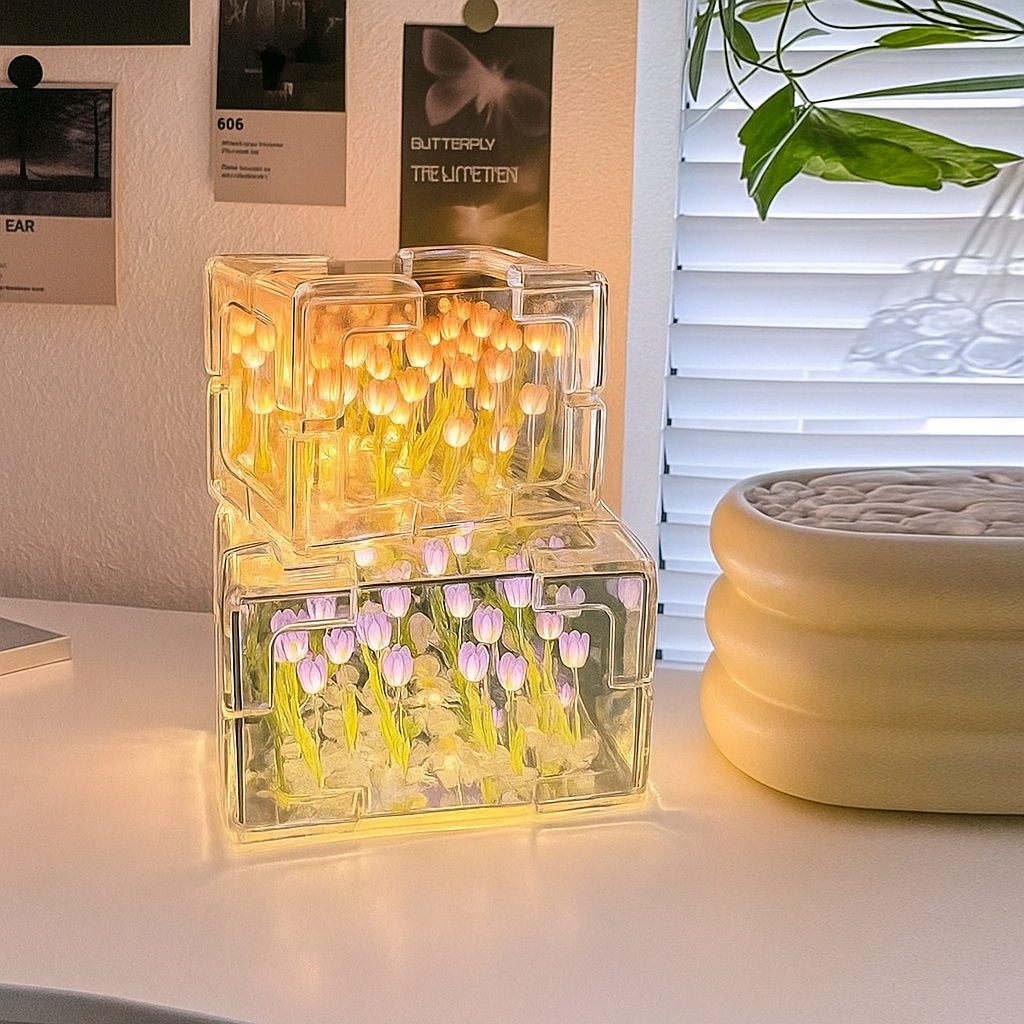 • Handcrafted Serenity: Each TulipHaven Lamp is a miniature field of tulips enclosed in a crystal-like cube, softly glowing to bring calm and comfort to your space.