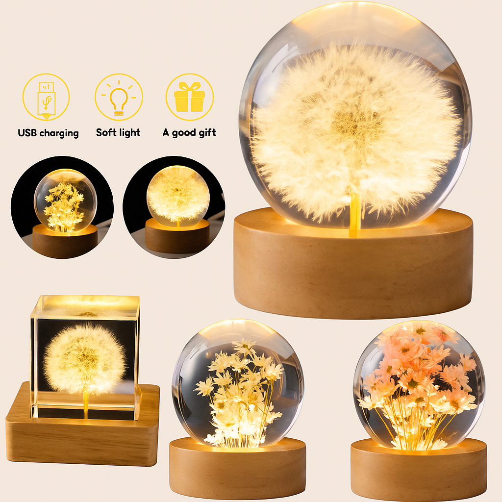 ✨ A delicate fusion of light and nature, where preserved blooms rest within a crystal sphere... radiating calm, beauty, and timeless warmth into your space.