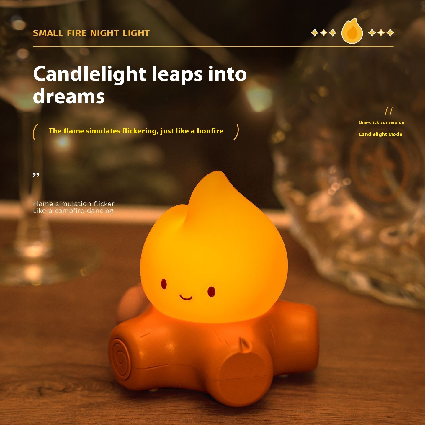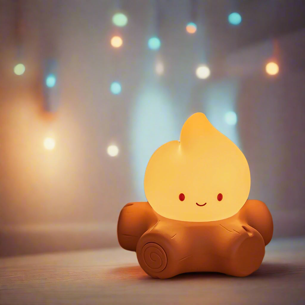 • Adorable Flame Design: A cozy, cartoon-style night lamp shaped like a happy little flame sitting on wooden logs. Perfect for bringing warmth and charm to any room.